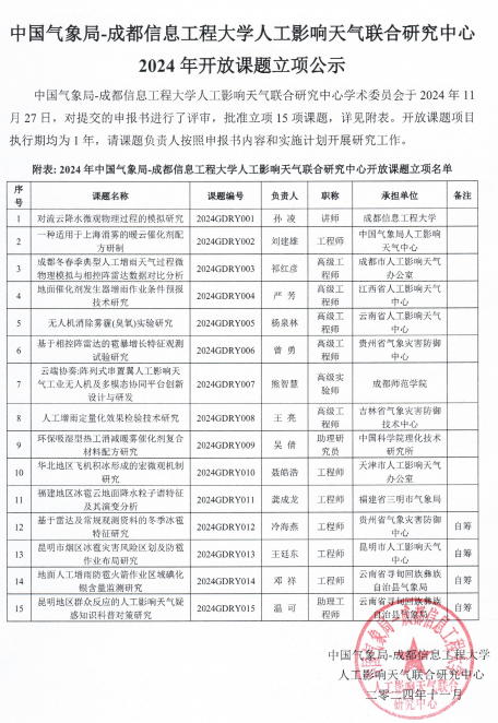 中国气象局-成都信息工程大学人工影响天气联合研究中心学术委员会于2024年11月27日,对提交的申报书进行了评审,批准立项15项课题,详见附表。开放课题项目执行期均为1年,请课题负责人按照申报书内容和实施计划开展研究工作。