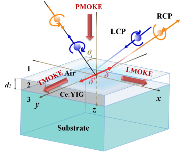 光自旋霍尔效应是由于光子的自旋-轨道耦合作用引起的线偏振光束的左、右旋圆偏振分量在几何空间上的分离(如图所示)。作为电子自旋霍尔效应在光学领域的类似现象,光自旋霍尔效应的研究极有可能导致新型光子学器件的产生,在精密测量、量子信息等领域发挥其巨大的应用潜力。然而由光的自旋-轨道相互作用所导致的光束质心的自旋分裂一般在亚波长量级(光波长的几分之一),这一效应很难被直接探测和应用。该论文通过在磁性介质薄膜上外加恒定磁场,并以负折射率超材料作为衬底,实现了对光自旋霍尔效应的极大增强和调控。研究结果显示,这种结构中的光自旋霍尔效应横向位移可达9.2微米,约为光波长的九倍,由磁场反向所引起的横移差值也达9微米。这一结果首次表明了外加磁场调控光自旋霍尔效应的可能性。