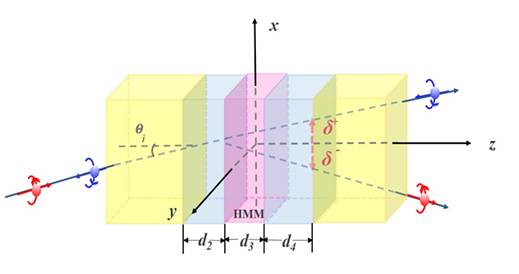 光自旋霍尔效应是由于光子的自旋-轨道耦合作用引起的线偏振光束的左、右旋圆偏振分量在空间上的分离(如图所示)。与电子自旋霍尔效应引发科学界对研制新型电子元器件的设想一样,光自旋霍尔效应的研究极有可能导致新型光子学器件的产生,在精密测量、量子信息等领域发挥其巨大的应用潜力。然而由光的自旋-轨道相互作用所导致的光束质心的自旋分裂一般在亚波长量级(光波长的几分之一),这一效应很难被直接探测和应用。该论文构建了一个二氧化硅-空气-超材料-空气-二氧化硅的光子衰减全反射(frustrated total internal reflection,FTIR)模型,实现了对光自旋霍尔效应的极大增强和自由调控。研究结果显示通过这种光子隧穿波导的设计,光自旋霍尔效应的横向位移可达38微米。同时,超材料的设计灵活性也为光自旋霍尔效应的操控提供了一种便捷的方式。