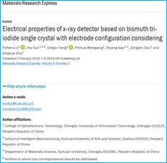 近日,betway西汉姆联平台2015级材料物理专业刘一臻同学以第一作者在材料类国际期刊《Materials Research Express》(IF=1.151)上发表题为“Electrical properties of x-ray detector based on bismuth tri-iodide single crystal with electrode configuration considering”的学术论文,报道了采用物理气相输运法生长厘米级尺寸高质量BiI3单晶体,并根据晶体结构的特殊性研制出三种结构的X射线探测器原型,在0.02V/um的超低偏置电压下获得了高达0.526×104uC/Gy/cm2的X射线探测灵敏度和896.4的光电转换信噪比,验证了BiI3材料在X射线探测器领域应用的可行性,并进一步阐明了晶体结构与电极配置对探测器性能的影响关系,对研究新一代环保型X射线探测器具有重要的科学价值和现实意义。论文指导老师孙辉博士为通讯作者,成都信息工程大学为第一署名单位。本论文得到国家自然科学基金(11675029)和四川省科技厅应用基础研究项目(2017JY0320、2018JY0513)的资助。