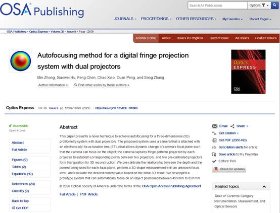 近日,我院“光电成像与三维传感”团队钟敏副教授以第一作者在光学工程领域TOP期Optics Express(影响因子:3.561,中科院SCI分区2区)上发表的论文“Autofocusing method for a digital fringe projection system with dual projectors”被期刊编辑评为精选论文。本期共发表132篇期刊论文,精选论文仅3篇。