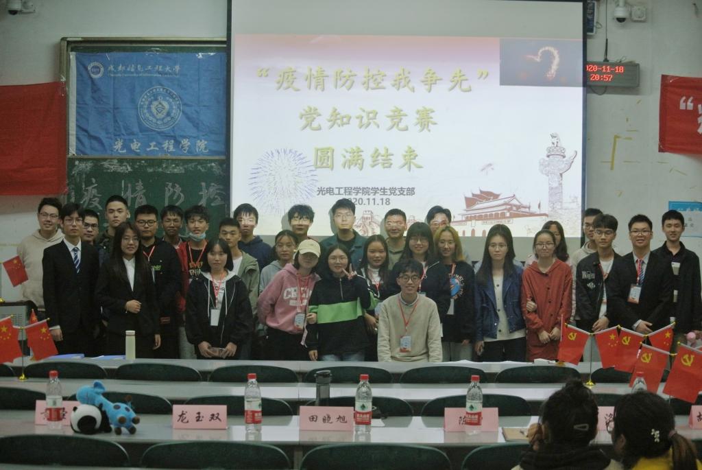 赛前,为使本次比赛顺利进行,我院党支部制定了详细计划,反复排练。本次比赛紧扣疫情防控,内容涵盖了党章、党史、党规以及时政。经过近一周的宣传,共有313位同学参加比赛,团体赛报名共92组,个人赛报名共49名。初赛以笔试的形式进行,经过严格的选拔,共有9支团队以及8位个人选手晋级决赛。决赛分为团体赛和个人赛两部分,期间也设有有观众互动答题环节。比赛中各位参赛选手秉持公平公正的原则,各个精神饱满,对答如流,现场掌声不断,充分体现了光电学子力争上游,锐意进取的精神。在互动环节中,观众积极回答问题,无论是参赛选手亦或是现场观众都表现出同学们党政知识的丰富储备。在你追我赶的答题中,比赛接近尾声,35位参赛者均取得理想的成绩,最后,本次比赛所有参赛者及工作人员合影留念。
