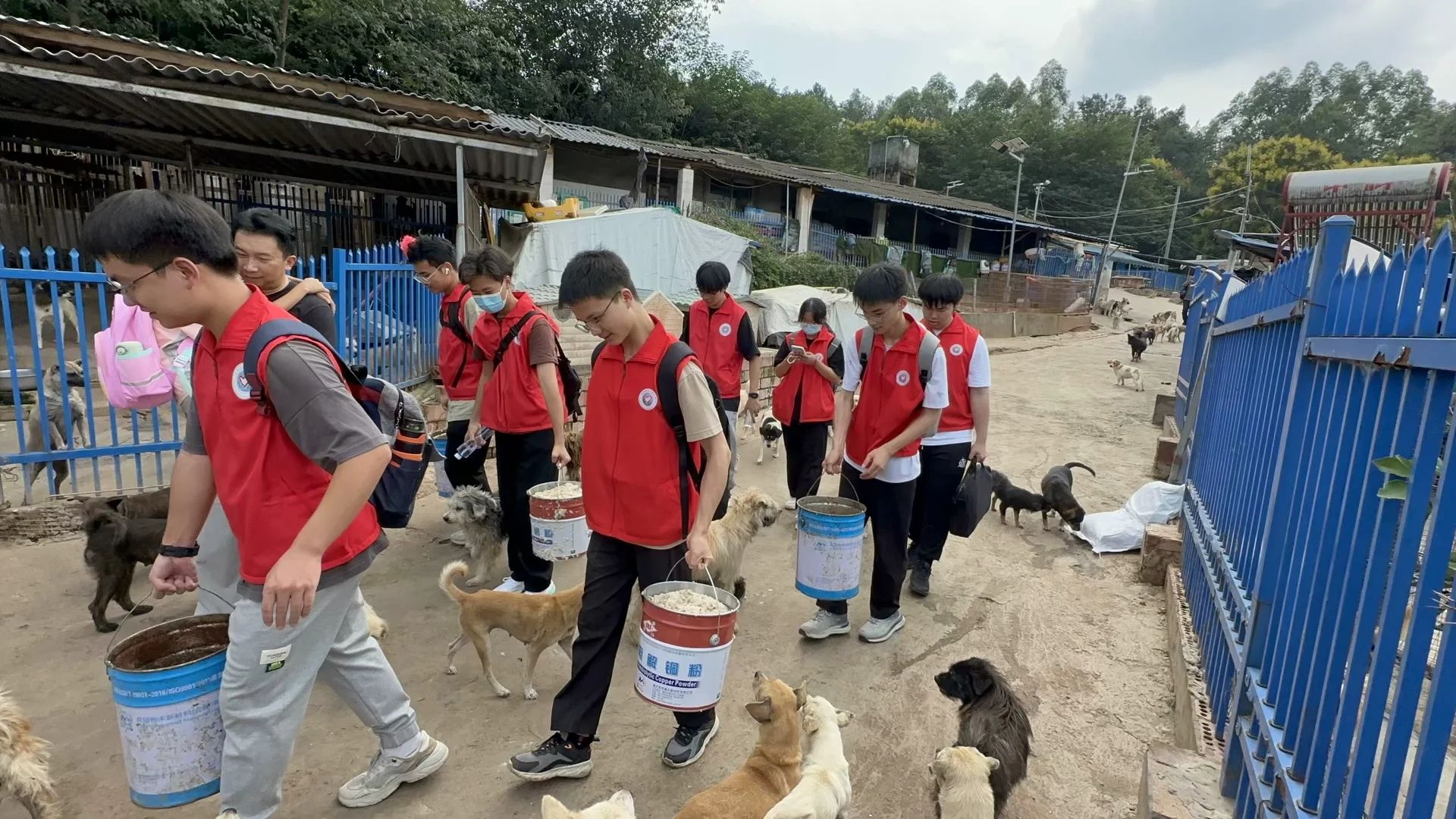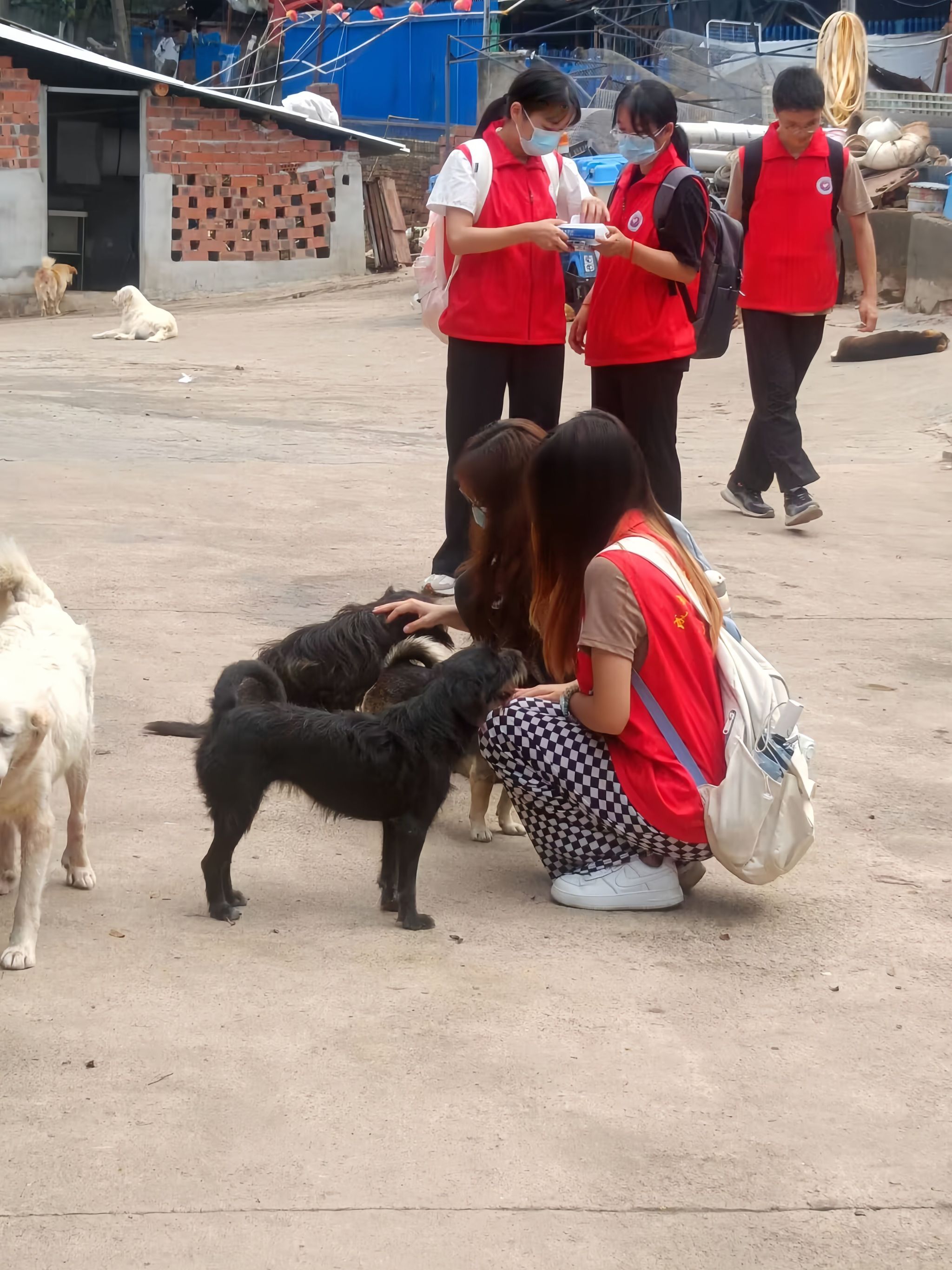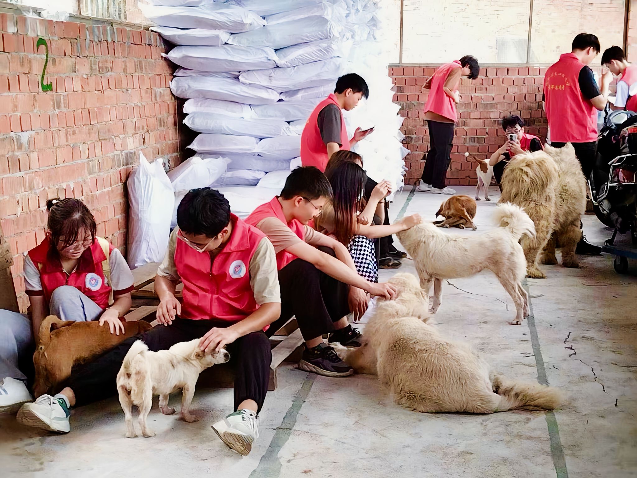 在此次志愿活动中,志愿者们分为两组。一组前往仓库帮助工作人员搬运流浪猫狗所需物资,在此期间,面对冗杂的物资堆放,他们分工协作,有序搬运,将物资一袋一袋从仓库运出。另外一组前去饲喂流浪猫狗,因为猫狗数量较多,志愿者人数有限,他们就通过分区域合作进行。满院的流浪动物们围绕在志愿者周围,但志愿者们仍然一个个弯下腰俯下身细心饲喂。尽管天气炎热但志愿者们从未懈怠。在活动进行过程中,志愿者们也遇到了前往救助中心捐赠物资以及领养动物的爱心人士和医疗救护人员,他们都是一群热爱、关注流浪动物的人,正是因为他们的到来,使得志愿者们得到了专业的帮助,大家齐心协力,共同合作,为流浪动物搭建起了一个温暖的家。任务结束后,志愿者们也共同拍摄了一张合照,为本次志愿活动画上了一个完美的句号。