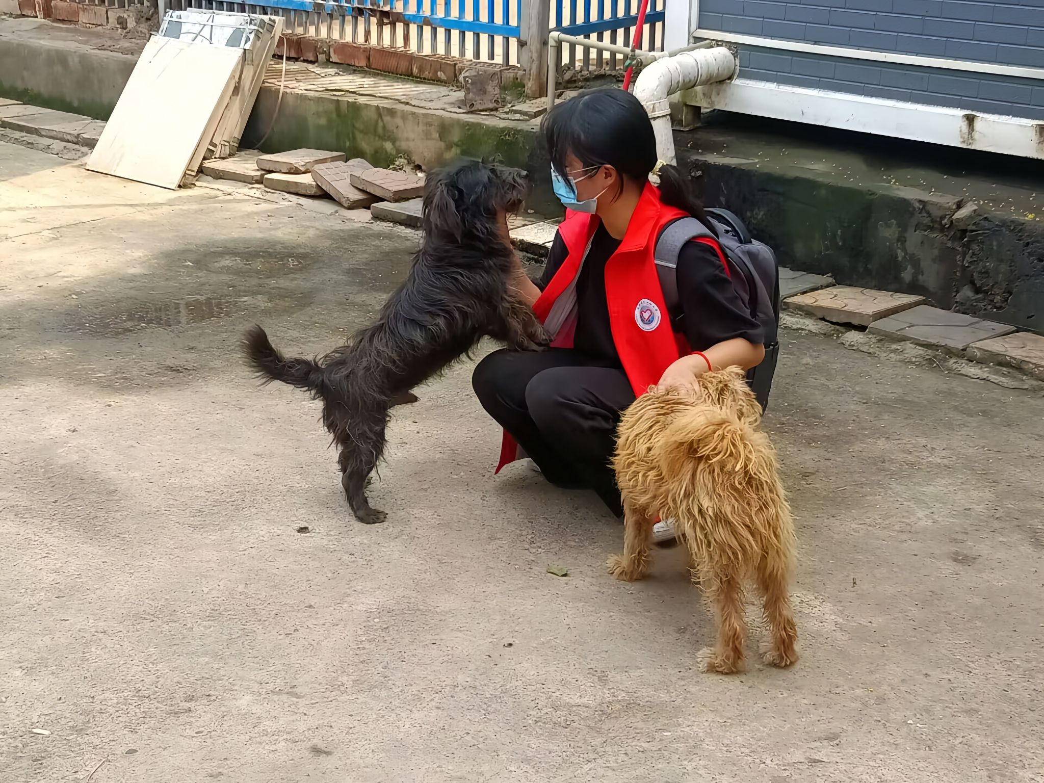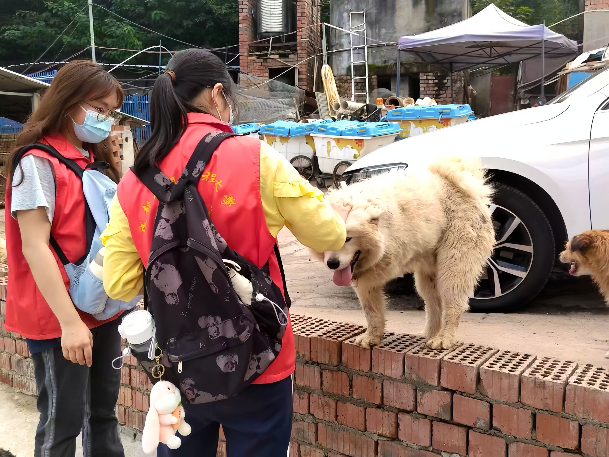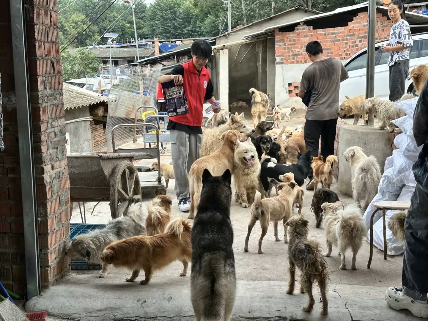 在此次志愿活动中,志愿者们分为两组。一组前往仓库帮助工作人员搬运流浪猫狗所需物资,在此期间,面对冗杂的物资堆放,他们分工协作,有序搬运,将物资一袋一袋从仓库运出。另外一组前去饲喂流浪猫狗,因为猫狗数量较多,志愿者人数有限,他们就通过分区域合作进行。满院的流浪动物们围绕在志愿者周围,但志愿者们仍然一个个弯下腰俯下身细心饲喂。尽管天气炎热但志愿者们从未懈怠。在活动进行过程中,志愿者们也遇到了前往救助中心捐赠物资以及领养动物的爱心人士和医疗救护人员,他们都是一群热爱、关注流浪动物的人,正是因为他们的到来,使得志愿者们得到了专业的帮助,大家齐心协力,共同合作,为流浪动物搭建起了一个温暖的家。任务结束后,志愿者们也共同拍摄了一张合照,为本次志愿活动画上了一个完美的句号。
