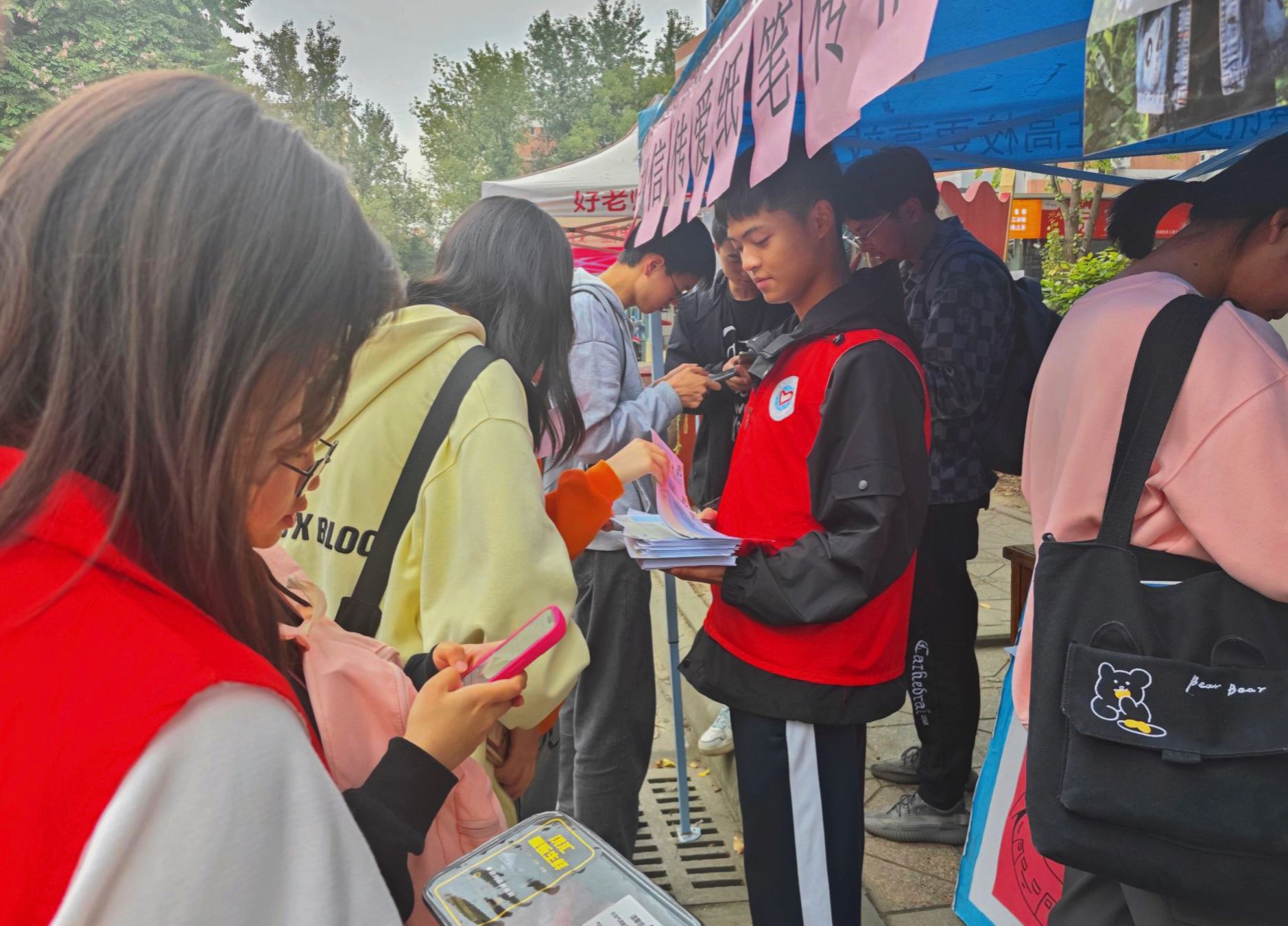 在活动现场,志愿者们积极热情地为同学们介绍“蓝信封”的由来,让同学们了解到这个以书信形式与留守儿童沟通交流的活动,并让感兴趣的同学扫码注册成为蓝信封通信大使的一员,为留守儿童带去更多陪伴和关爱。志愿者们还准备了便利贴,便于路过的同学写下对孩子们的祝福,然后将他们的祝福展示在摆点处前方的展板上。随着越来越多的便利贴被展示出来,越来越多的同学被吸引了过来。此外,宣传点位上还准备了一些来自小朋友们的信,小朋友们在信上写下了许多生活趣事与内心想法,希望能得到回信和建议。志愿者们将其分发给已经完成注册的同学,让同学们在向小朋友们给予关怀的同时,也能更多了解到小朋友们的世界。