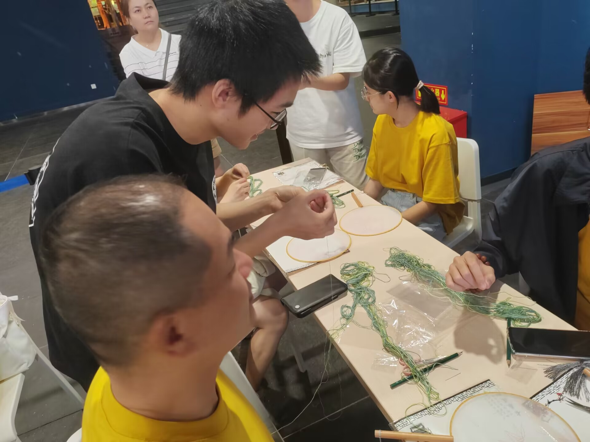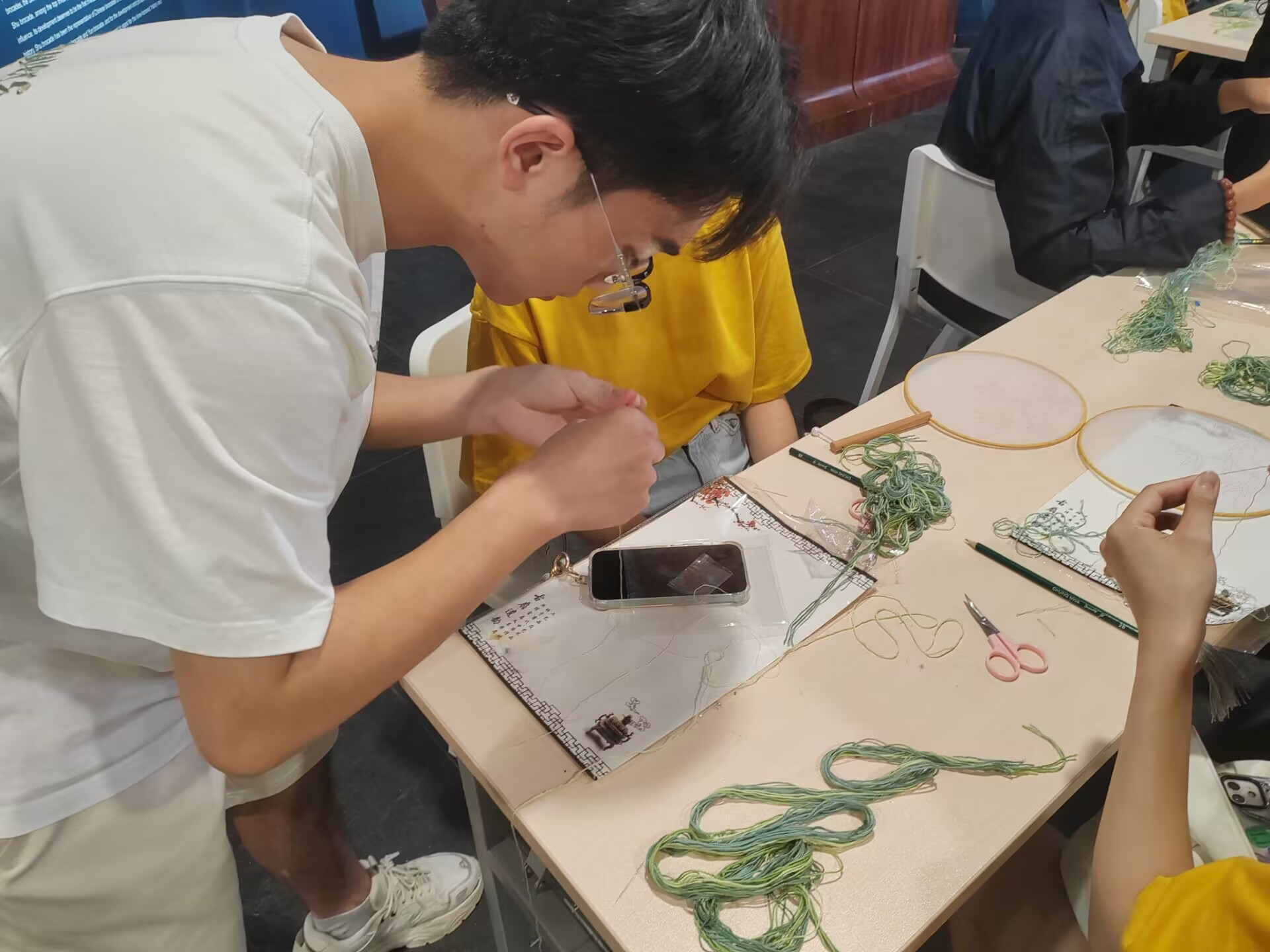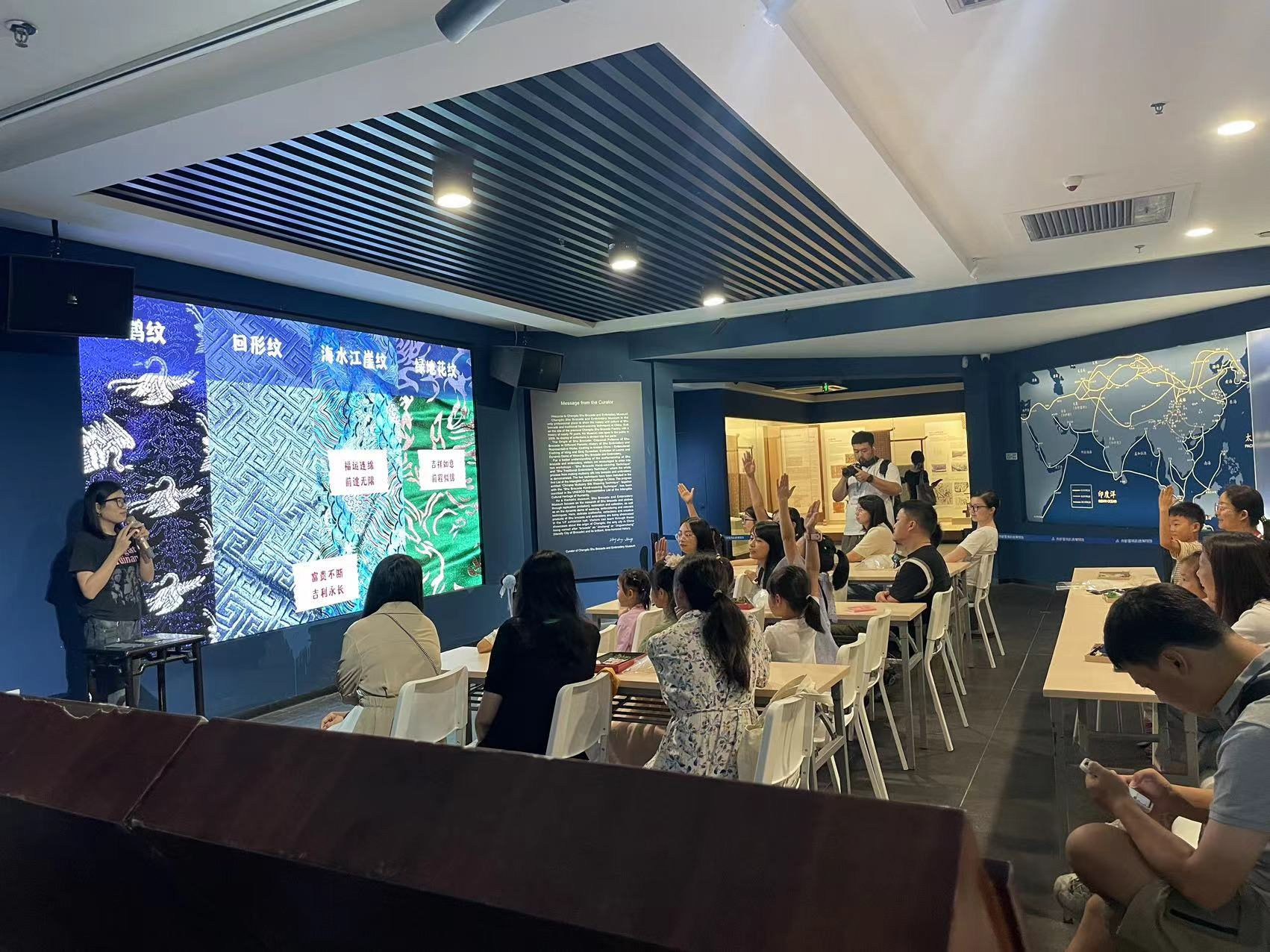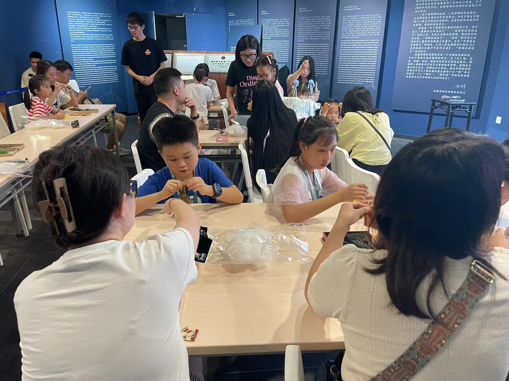 到达活动现场后,博物馆工作人员引领队伍穿梭于历史的长廊,详尽阐述了蜀锦与蜀绣的悠久历史、深厚渊源及其精湛绝伦的织造技艺。每一位志愿者者都沉浸在这份来自远古的技艺之美中,心中充满了对传统文化的无限敬仰与热爱。接下来,志愿者们协助博物馆工作人员,开始组织别开生面的蜀锦香囊与团扇制作体验。在专业指导下,无论是前来游学的学生,还是家庭旅行的游客,都纷纷动手,从精心挑选材料、创意设计到一针一线地细致缝制,每一步都凝聚着对蜀锦织绣文化的深情厚谊。香囊的缕缕芬芳与团扇的古典雅致,在大家的手中逐渐成形,不仅是对个人劳动成果的展示,更是对蜀锦织绣这一非物质文化遗产的崇高致敬。