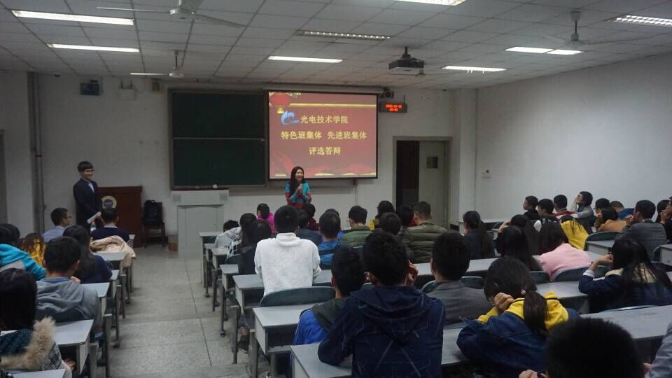 按照学校学生学风评优工作的统一部署,为推进光电技术学院班风、学风建设,营造学生进取争优氛围,提升班级管理能力和水平以及保障评优工作公开公正,11月13日晚7:00点,光电技术学院在1106教室举行了2014-2015年度校级“先进班集体”、“特色班集体”推选答辩会。光电技术学院党总支书记王嵩、各年级辅导员老师担当评委,全院入围答辩的8个班级以及其他各年级班团学生干部参加了会议。