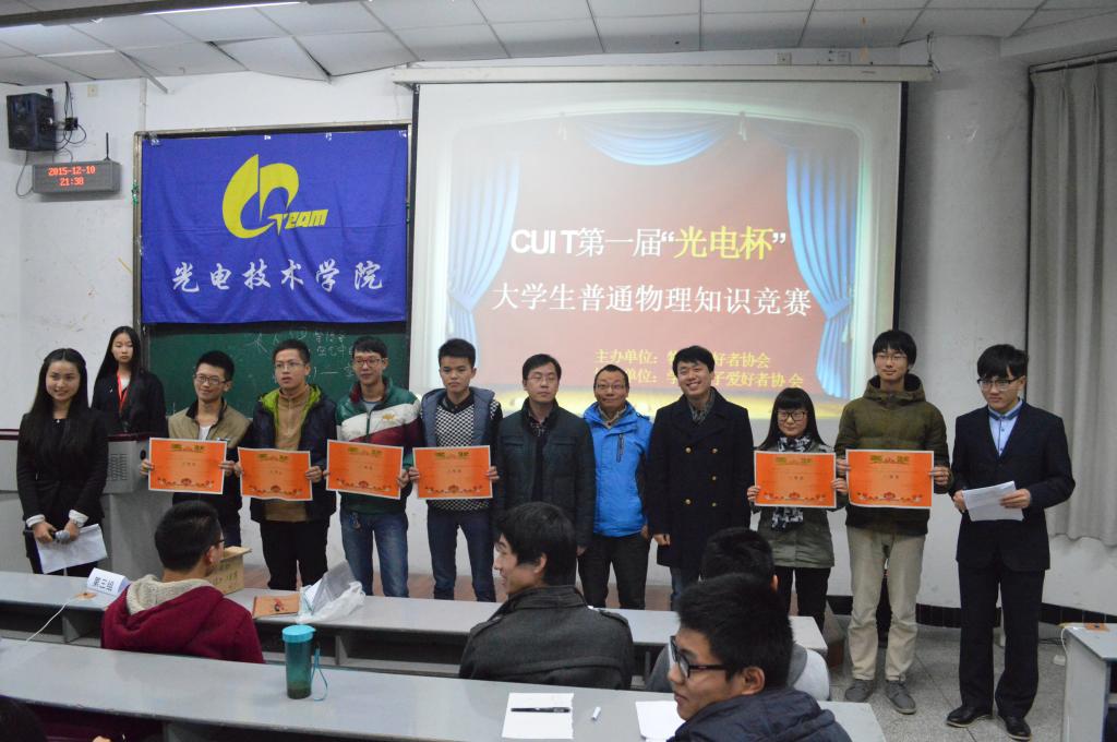 生活中处处离不开物理,物理知识的运用也是极其广泛。为提高我校同学对物理知识的学习兴趣,我院物理爱好者协会于12月10日晚七点在4213教室举办了成都信息工程大学第一届“光电杯”大学生普通物理知识竞赛。在学院老师的大力支持,学生电子爱好者协会的各方面帮助,我院物理爱好者协会所有同学这近一个月的不断努力与比赛现场所有评委老师、学生评委、参赛选手的精彩表现下,竞赛取得圆满成功。