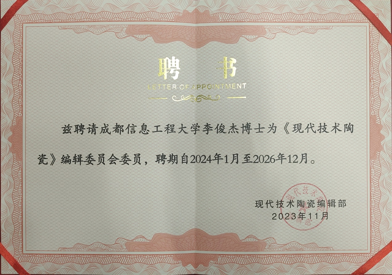 据悉,学院青年教师李俊杰博士近期入选《Journal of Advanced Ceramics》(中科院1区Top期刊,IF = 16.9)《现代技术陶瓷》编辑委员会委员。