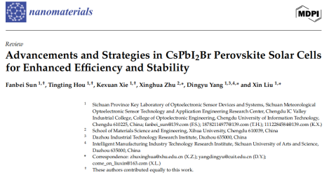 近日,成都信息工程大学betway西汉姆联平台新能源材料与器件团队杨定宇、刘欣老师作为通讯作者在SCI期刊《Nanomaterials》(影响因子:4.4)上以我院为第一署名单位发表了题为 “Advancements and Strategies in CsPbI2Br Perovskite Solar Cells for Enhanced Efficiency and Stability” 的研究论文。我院电子科学与技术系本科生2023级孙凡焙、侯婷婷、谢柯轩同学为论文共同第一作者。